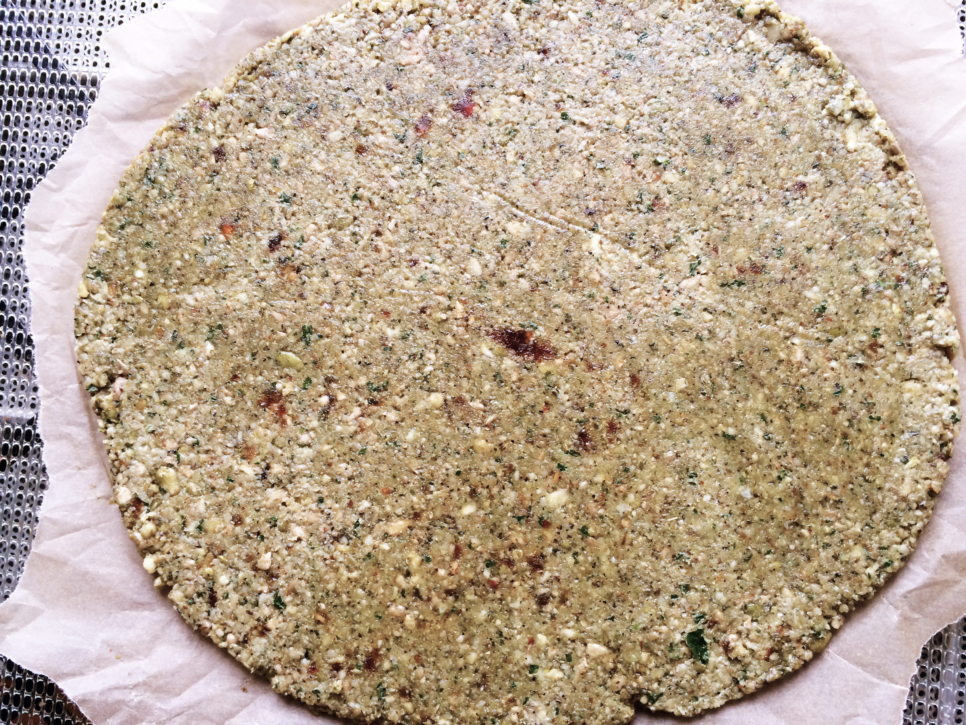 place all ingredients in a food processor and process until a ball forms. place the dough ball between two pieces of unbleached parchment paper and flatten using a large cutting board. with a rolling pin be sure the crust is smooth and even. i usually tear off the extra parchment paper and leave underneath the crust until it’s ready to flip. as you would save the cardboard below your frozen pizza to use again, you are able to do the same with your parchment paper. dehydrate @110. flip after three hours and continue to dehydrate until crisp, about 10.5 hours. store in a glass container.